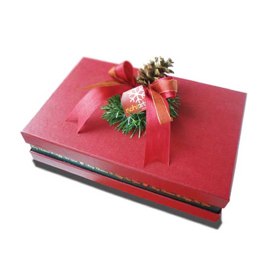 This cardboard gift box comes with an eye-catching red-colored cover, which is topped with decorative ribbon and pine. The rectangular shape is flexible in holding precious gift items such as chocolate, cookie, jewelry and so on. The high-gloss surface further adds value to this box.