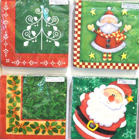 The featured items are paper napkins with colourful prints. Prints on the napkins feature Christmas designs like Santa Claus and Christmas trees.