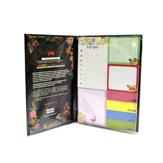 Displayed is a paper notebook that is designed in a sticky note theme. Each page is colorful with different types of sticky notes for a fun effect. Made of high quality, this notebook is a good personal stationery item or as a gift.