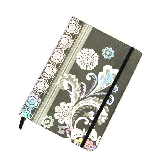Displayed is a paper notebook featuring a sparkling cover with reflective flowers on a black background. This notebook comes with an elastic band on the side for better security. This paper notebook is made of high quality paper and is comfortable to write on.