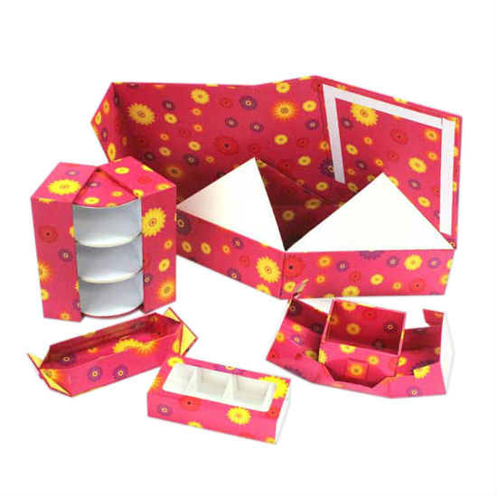 This paper packaging box set is printed with sunflowers for a cheerful accent. The assorted compartments neatly accommodate different items for easy pick-up. These boxes are great for packaging jewelry, cosmetic and gift items.