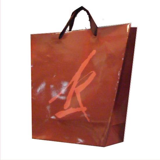 This is a beautiful shopping bag. The paper shopping bag is designed with a special cutting and painted a large letter of "k" in the middle. The brown colored bag comes with a brown colored strap for carrying.