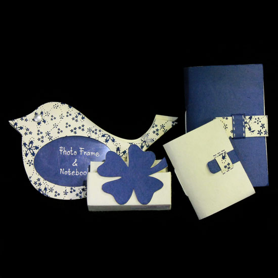 The paper stationery set in this photo is decorated in with blue-and-white motif that flaunts an artistic accent. Each piece is covered with suede-like fabric to enhance elegance. This paper stationery set makes a useful and decorative gift for friends.