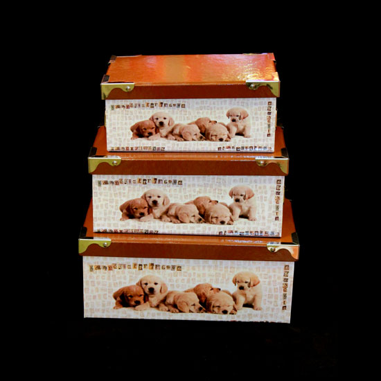 This rectangular storage box features a cute puppy print. Paired with lids of solid brown colors, this storage box is practical as well as good looking. With its corners strengthened by metal parts, this paper box is strong and durable.