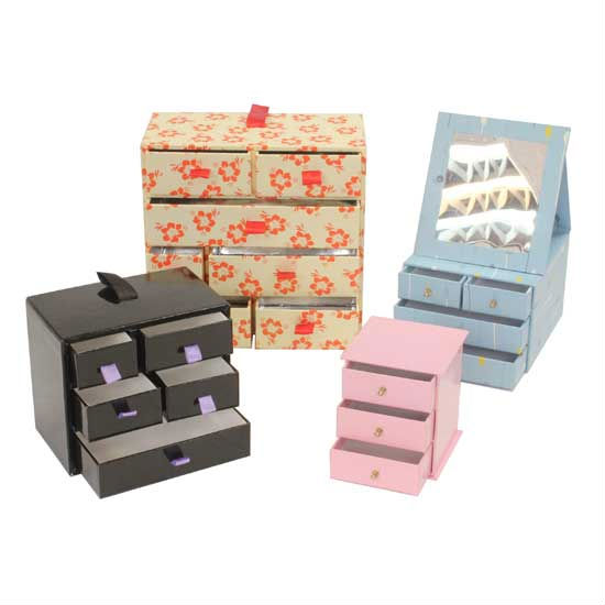 Showcased are four storage boxes made of plain-colored and printed cardboard. They feature multiple compartments and built-in mirrors. These delicate boxes are excellent for storing miscellaneous items.