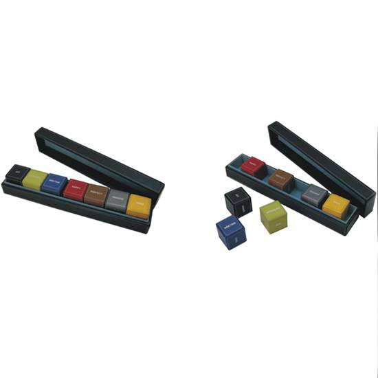 This is a paper weight set that has 7 cubes with 7 different colours. These cubes are made of flannel with PU coating, thus they are comfortable and handy to play with. This box set looks presentable and elegant to be sent as a gift.