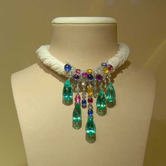 This impressive dangle necklace features tortoise green paraiba with a pear cut, shimmering in unique bluish green radiance of a neon or electric-like quality. The pendant also hangs fancy round sapphire stones, shining in lustrous radiance. The gorgeous necklace comes with a silk mesh band, the clever combination makes it a coveted jewelry item of young girls.