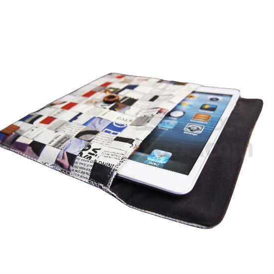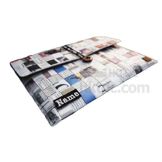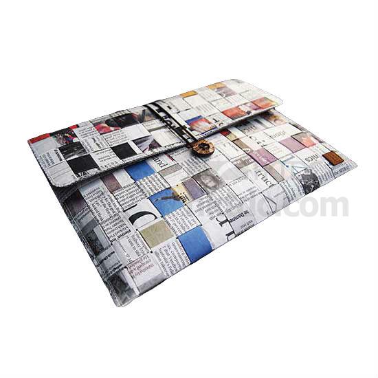 This tablet PC bag is made of thin processed newspaper stripes. The stripes are woven using recycled newspapers and pressed with a PE layer on the top, which makes this bag waterproof and wear-resistant. The stripes are wrapped with a cotton-padded layer inside before weaving. This bag is fastened by a button made of rubber and coconut shell.
