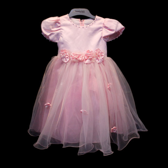 This party dress is especially designed for little girls in a dreamy pink color. The party dress comes with puffed short sleeves and a round neckline. The floral details on the waistband and a sheer overlay on the dress complete this adorable dress.