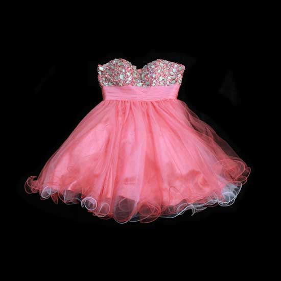 This captivating pink party dress with a sweetheart neckline flaunts beads and stones over the bodice with a sense of vogue. The pleated waistband is sure to show off alluring feminine silhouettes. The skirt with sheer fabrics is finished with flounce hems for a flirty touch.