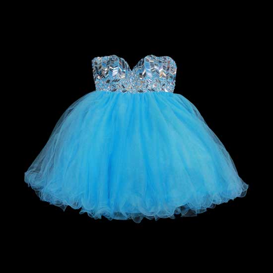 This gorgeous party dress is characterized by its silvery embellishments in zigzag patterns, evoking a sense of vogue. The sweetheart neckline is sure to show off alluring feminine curves. The turquoise blue skirt is designed with tiers of sheer fabrics with flounce hems for a flirty touch.