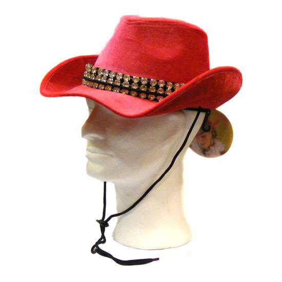 This party hat is in the design of a Cowboy hat. The red hat is decorated with a belt of shiny beads at the edge of the hat crown. It is also designed with a strap to hold the hat. The hat is perfect for party goers who dress up like cowboys.