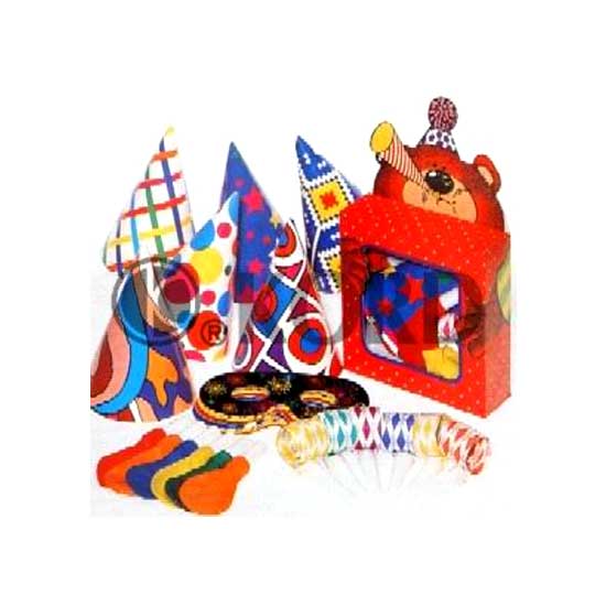 The party assortment set is designed for 6 persons. It comes with hats, masks, blowouts and balloons in a bear gift box. The assortment set is a must-have for parties and celebrations.