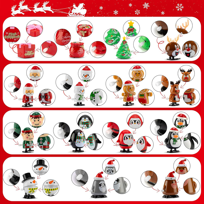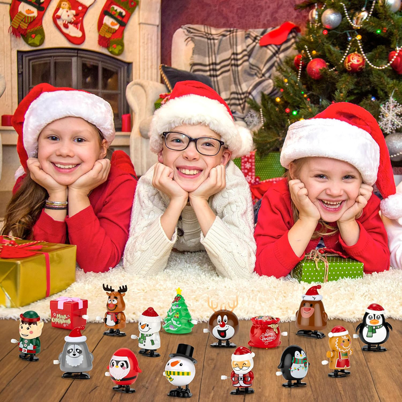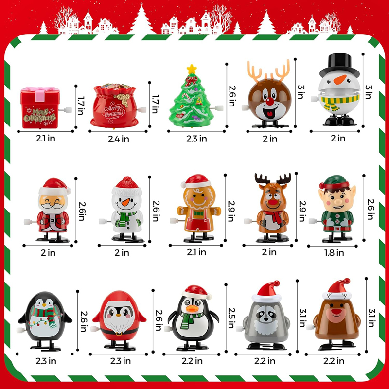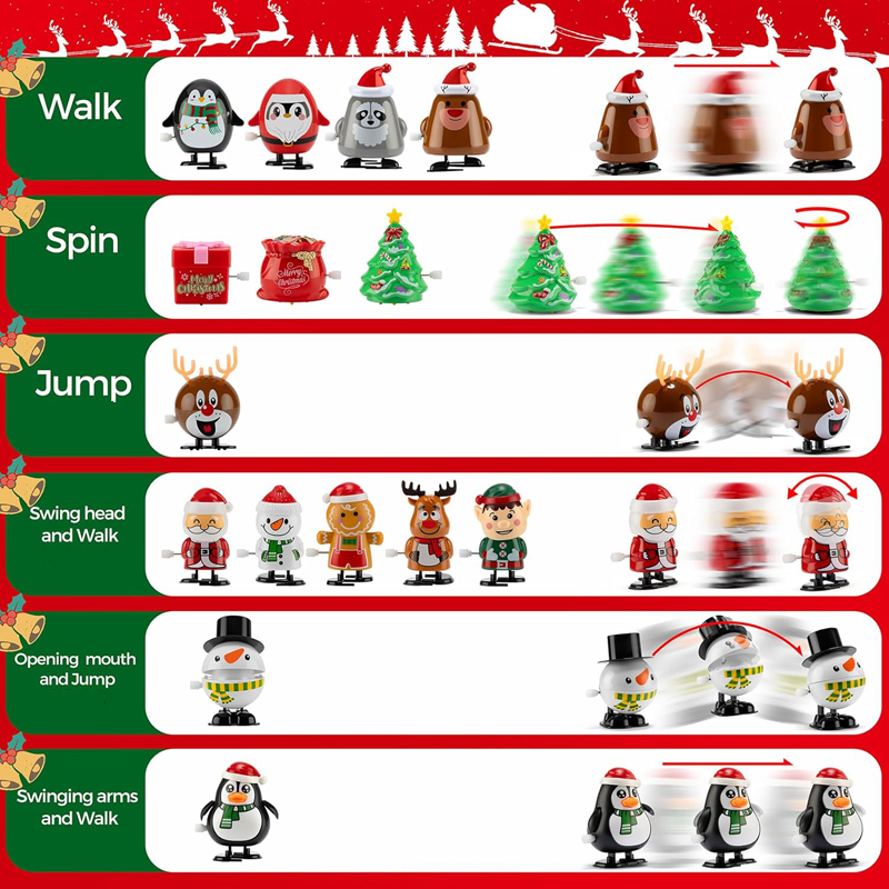 Christmas Wind up Toys for kids: This christmas party favors sets come with 15pcs different Christmas theme wind up toys such as Santa, Reindeer, Snowman, Penguin,Christmas Tree etc. the perfect size for toddler’s little hands to grasp it to play. 2.Interesting Christmas Clockwork Toys: Just use your finger to simply turn and hold the clockwork mechanism, then let it walk on the floor or desk, and go far without electricity. These clockwork toys can perfom a range of actions such as flipping, walking, shaking head and else. Use these play a race with kids and friends who can run faster or longer, and the cute little actions make the children giggle 3.Lightweight & Durable & Reusable Party Favor: These mini toy assortment are made of high quality safety plastic material which lightweight to carry, Non-toxic, Odorless, No sharp parts, Not rust or fade, Not easy to wear and break, super durable for lasting a long time, and totally safe for kids to play 4.Perfect Small Gifts for kids to Play : Different Christmas theme wind up toys are suitable for party favors, goodie bags, classroom rewards, stocking stuffers, Easter egg stuffers, and carnival prizes. To help you create an exciting and funny atmosphere for family or classes party