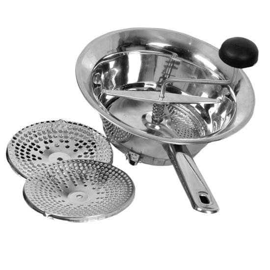 This is a set of passapure which is made of stainless steel. The passapure is equipped with handle and removeable disc.