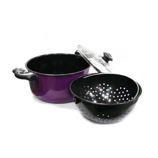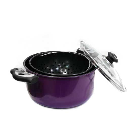 This modern pasta pot set features a purple exterior for attractiveness. It is constructed from carbon steel for sturdiness and durability. The dual-handle design offers maximum convenience for users.