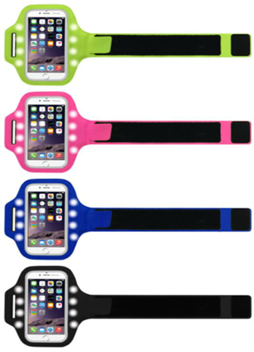 The highlighted sports armband is made of lycra, TPU and PVC. It has apocket designed for holding Samsung S4/5/6. There are LED lights on the side of the pocket and they offer 3 flashing modes. This armband allows you to conveniently carry your mobile devices while exercising.