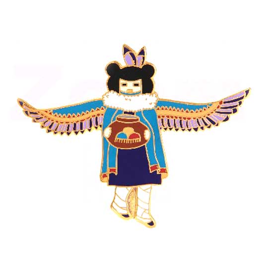 The badge portrays an ethnic lady with wings spreading from behind. The abundant use of colors elicits a whimsical touch. This badge is a great addition for badge collectors.