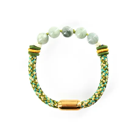 Knitted bracelet featuring vibrant multi-color nylon threads in intricate patterns, accented with semi-precious gemstones. Complete with a secure plated magnetic clasp.