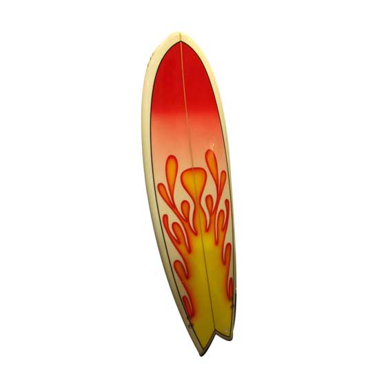 This surfboard comes in a streamlined fish shape with red flame patterns. The shape is good for those who want to keep their speed up in mellow soft or smaller waves. This surfboard provides the ability to do big moves in smaller surf.