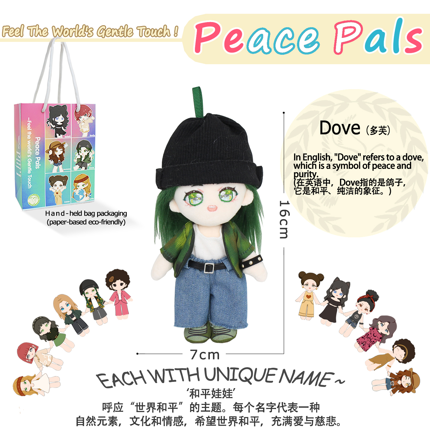 以“世界和平”为主题,设计了12个娃娃,每个娃娃都有自己的名字。它反映了自然、文化或情感的一部分,表达了我们对一个充满爱和善良的世界的愿望