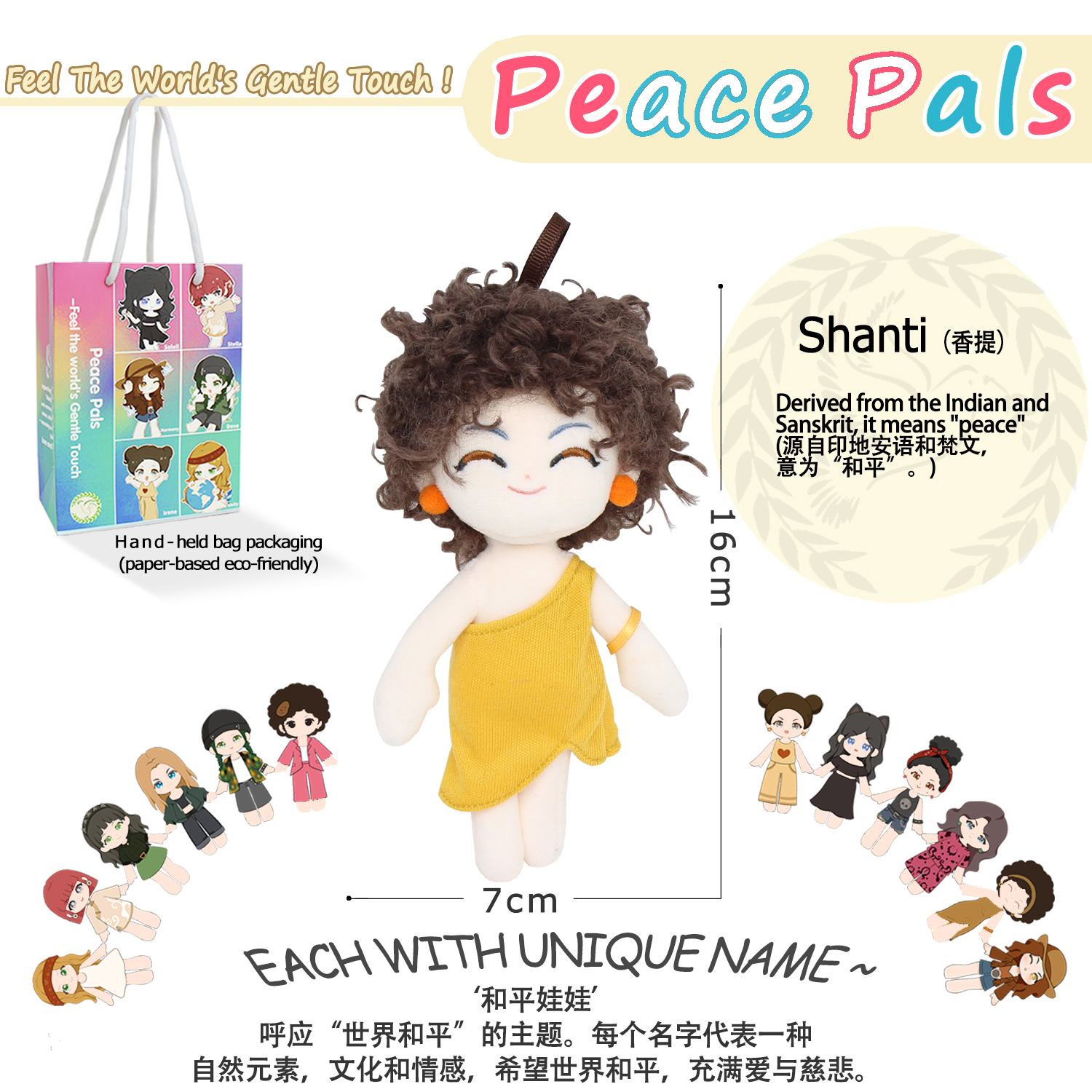 Inspired by the theme of "World Peace", 12 dolls were designed, each with its own name. It reflects a part of nature, culture or emotion, expressing our wish for a world full of love and kindness.