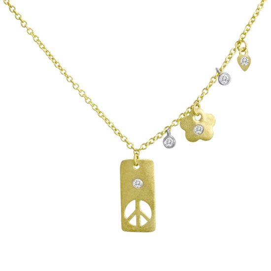 This gorgeous necklace is the Meira T. signature collection. It is well designed with yellow gold and diamond. The necklace features a cutout peace sign charm with diamond and gold accents for a sense of delicacy.