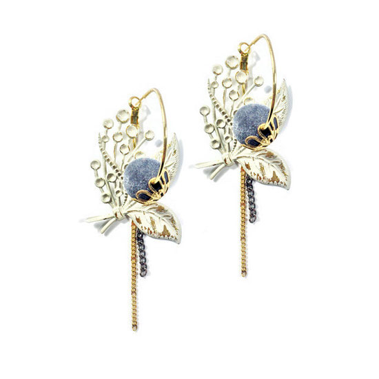 This pair of peacock earrings resembles the beauty and tenderness of women. The white-toned earrings are embellished with softly-hued stones and golden-colored trims for an eye-catching look. The earrings can be paired with both formal and casual outfits.
