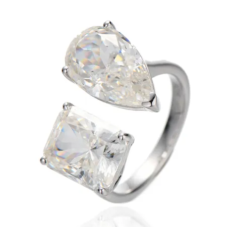 Pear Shape And Emerald Cut Diamond G Cubic Zircon Rhodium Silver Ring
