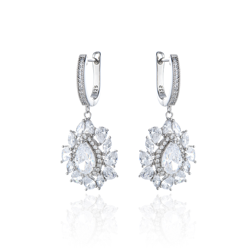 Pear Shape And Round White Cubic Zircon Rhodium Silver Earring