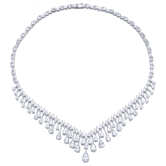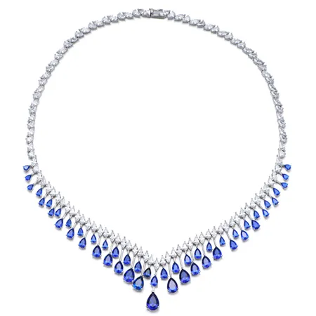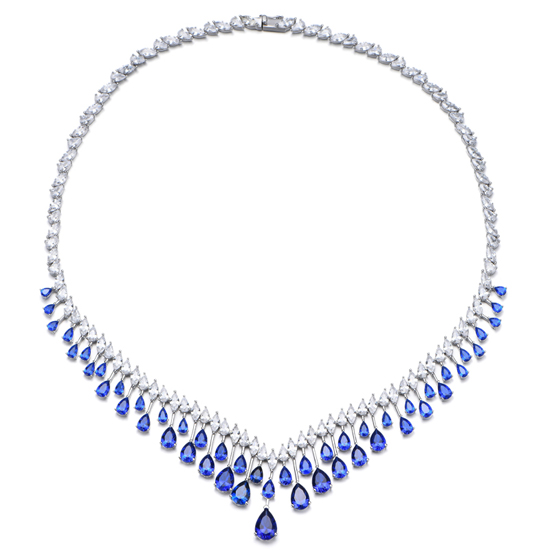 Pear Shape Blue Nano And Marquise White Cubic Zircon Rhodium Silver Necklace
