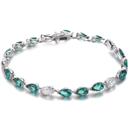 Pear Shape Green Nano And Oval Shape White Cubic Zircon Rhodium Silver Bracelet