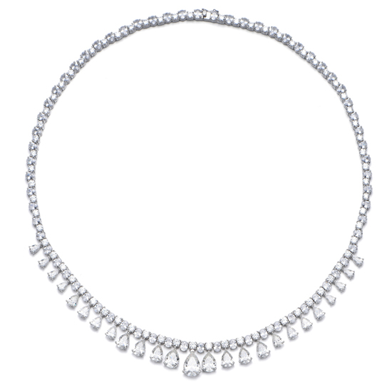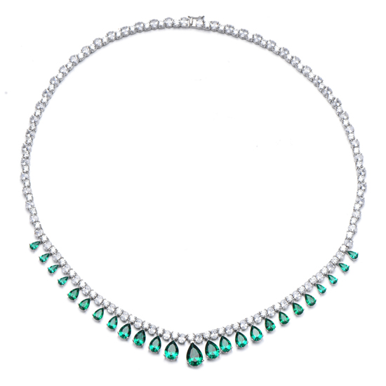 Pear Shape Green Nano And Oval Shape White Cubic Zircon Rhodium Silver Necklace