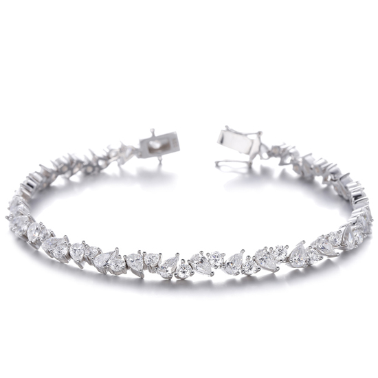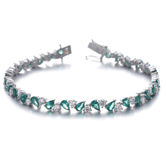 Pear Shape Green Nano And Round White Cubic Zircon Rhodium Silver Bracelet