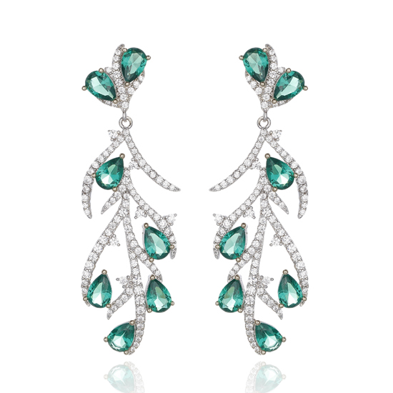 Pear Shape Green Nano And Round White Cubic Zircon Rhodium Silver Earring