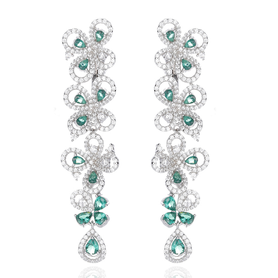 Pear Shape Green Nano And Round White Cubic Zircon Rhodium Silver Earring