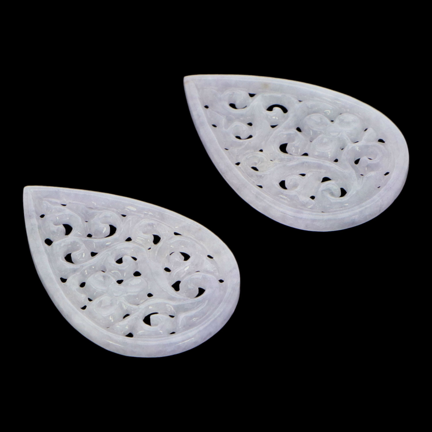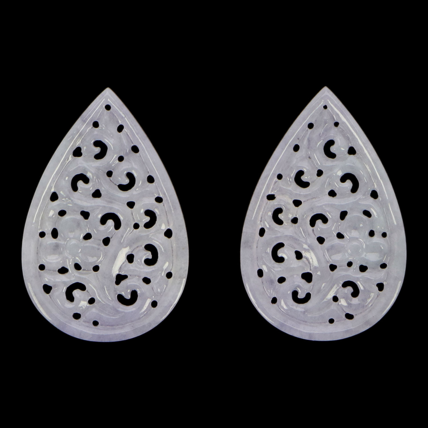 Classy and refined, these lavender jadeite jade earrings are a must-have in any fine jewelry collection. Skillfully forged from carefully selected lavender jadeite jade, this pair has a seemingly even coloration and a lustrous glow. The precious stone is handcrafted into a pair of pear-shaped earrings for a timeless and sophisticated appeal. Completed with thoughtfully arranged floral and swirl carvings, this piece will make for a gaze-stealing cocktail statement.