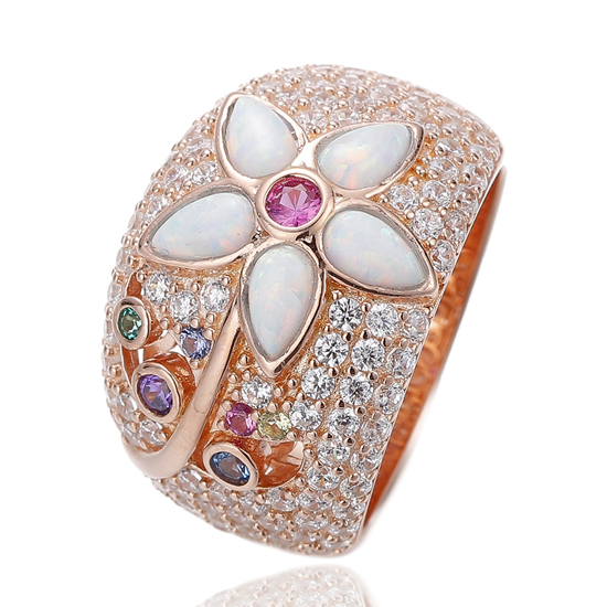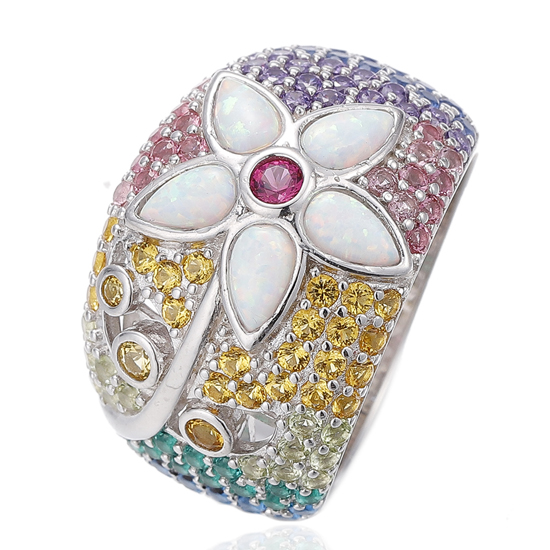 Pear Shape Opal And Round Rainbow Cubic Zircon Rhodium Silver Ring
