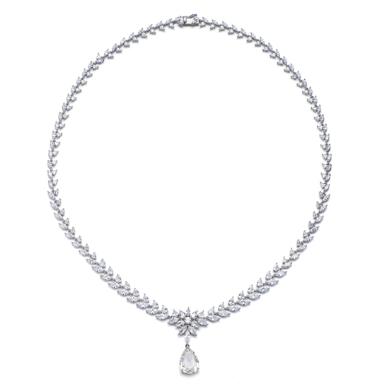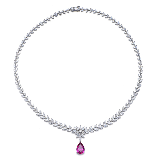 Pear Shape Ruby Corundum And Marquise White Cubic Zircon Rhodium Silver Necklace