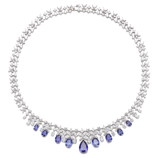 Pear Shape Tanzanite And White Cubic Zircon Rhodium Silver Necklace