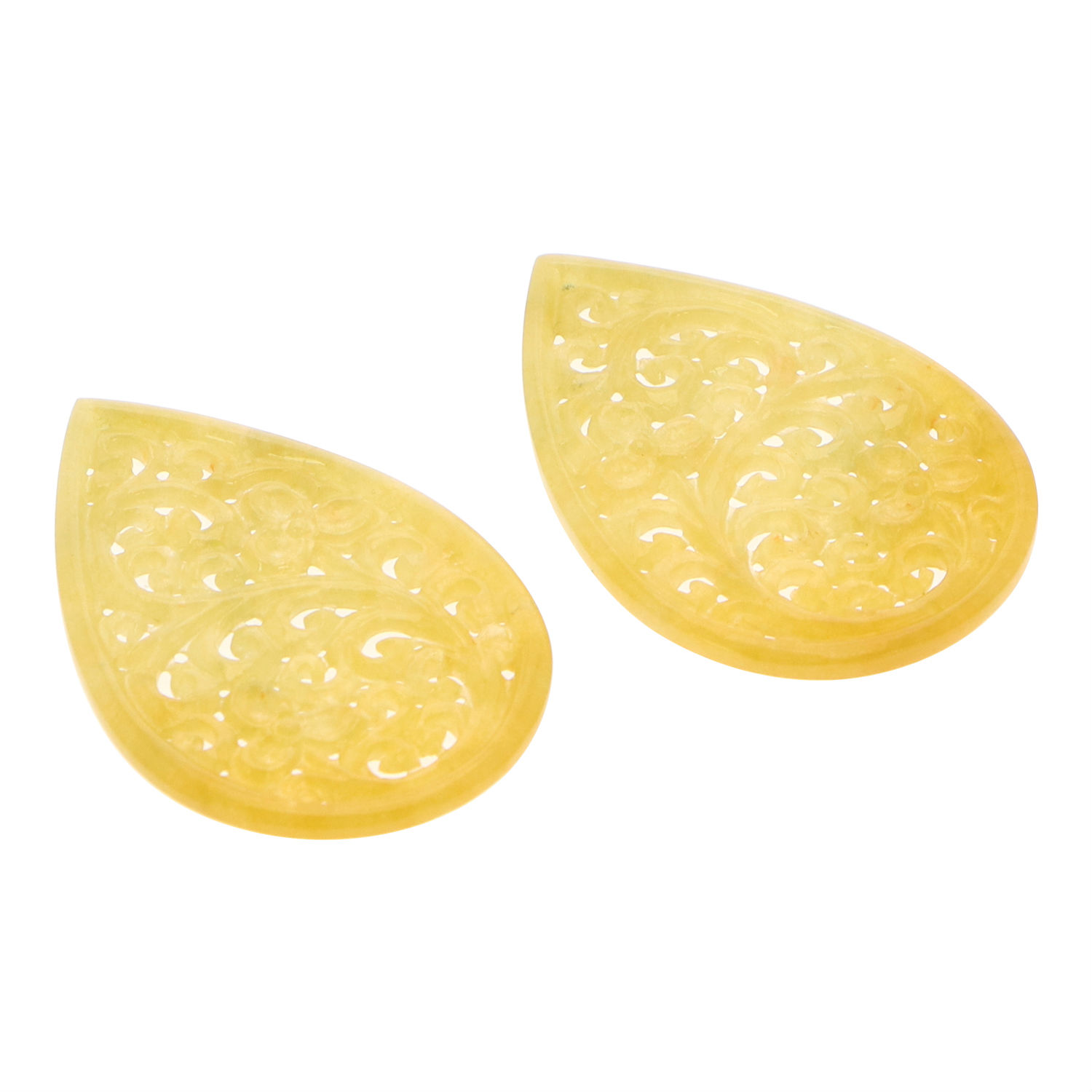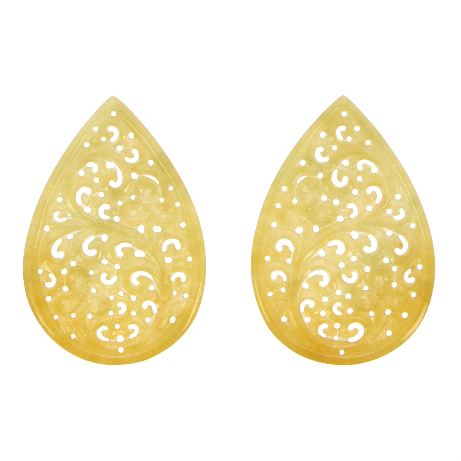 Dazzling and alluring from all angles, this pair of yellow jadeite jade earrings would appeal to all feminine ladies. Executed in a timeless and elegant pear shape, this luminous pair seems like an antique once worn by royals. Set within the piece are intricate swirl carvings interlaced with floral patterns that best displayed its exquisite craftsmanship. With a vintage design paired with heirloom quality, this number is the one to go back to time and time again.