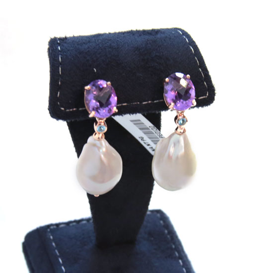 These earrings are made from silver, fresh water pearls and amethysts. The oval-cut amethysts are nicely selected and polished to offer a purple hue. Adorn your cocktail dress instantly with these beautiful earrings.