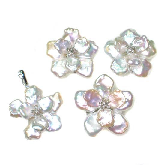 This is a set of pearl and diamond jewellery for ladies and women, including a pendant, a ring and a pair of stud earrings. Each piece features pearl flower petals, decorated with six small natural-coloured diamonds as its bud, which is set on a 14K and 18K yellow or white gold setting.