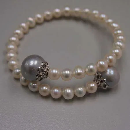 This shimmering pearl bangle consists of white round potato-shaped pearls with high luster and smooth surface. It is finely crafted with two large gray pearls that are set on metal mountings for a striking effect. This stylish bangle shines with a highly polished finish.