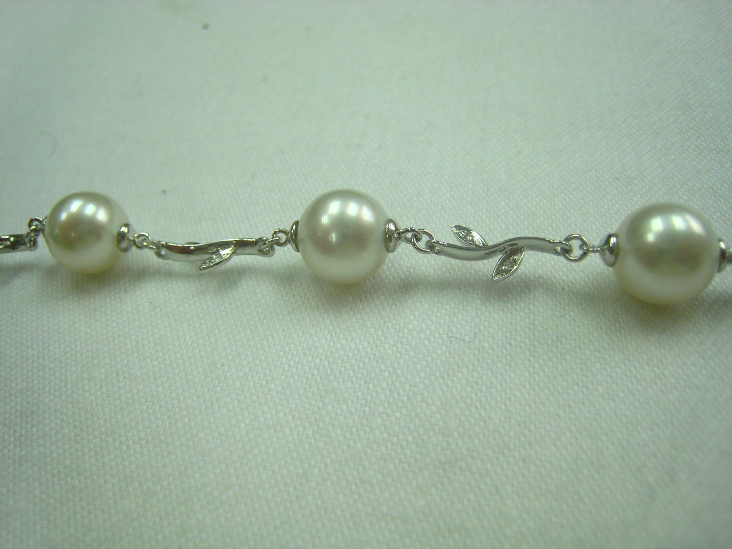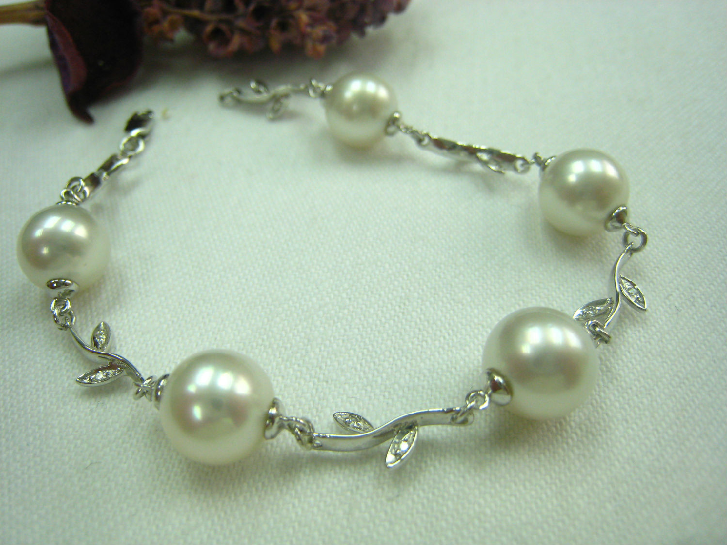 Accessorize yourself with this captivating bracelet. The item comes in five pearls in total, which are linked together with unique components. These delicate parts bear similarity to stems and leaves, while the leaves paved with small diamante details are sparkling. Set off to a garden party in a tea dress with it girls!