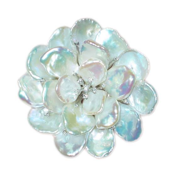 As shown is a pearl brooch in flower pattern. The coin pearls are nicely mounted as the petals, featuring diamond beads as the pistils. It is available in 18k and 14k yellow or white gold.