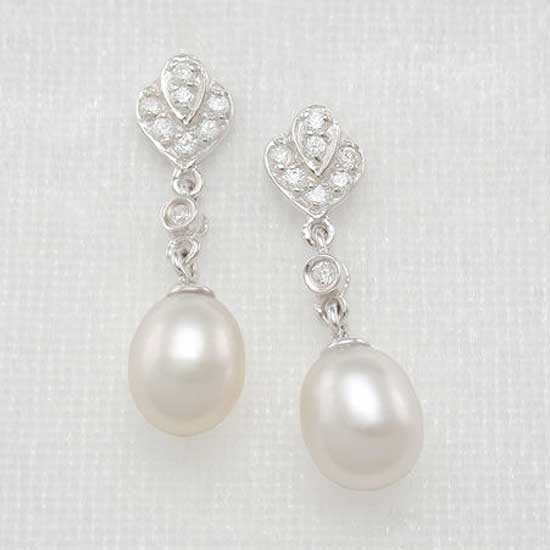 The earrings are made of 925 silver, set with white pearls and cubic zirconias. The bails are designed in a heart shape with bead-set cubic zirconias. They link the spherical freshwater pearls with other CZ stones in full bezel setting.