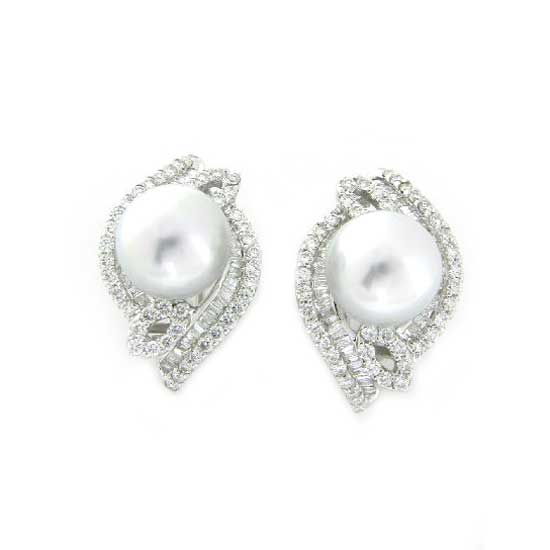 Displayed is a pair of pearl earrings that comes in a stud style. Mounted on 18K white gold, these earrings are accented with diamonds for an elegant look. This pair of pearl earrings is a good choice for cocktail parties.
