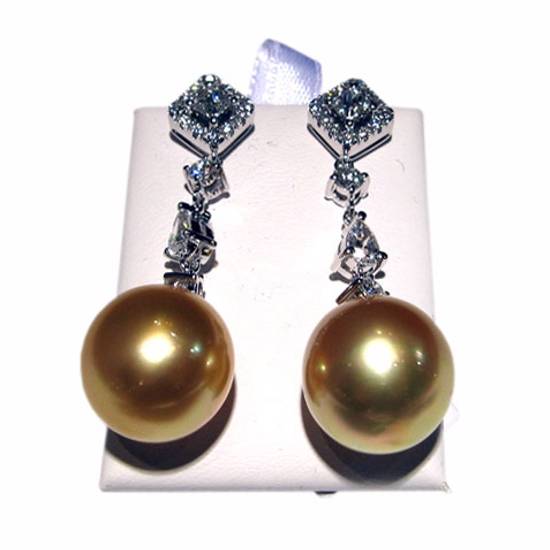 • 2 spherical South Sea pearls in golden colour used as the drops of the earrings.