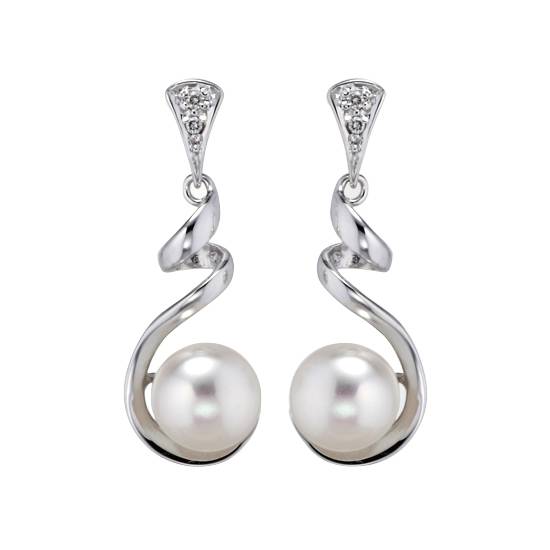 The featured items is a pair of pearl earrings. The earrings is in a spiral design, as well as mounted with a white pearl. Diamonds are encrusted at the stud area.